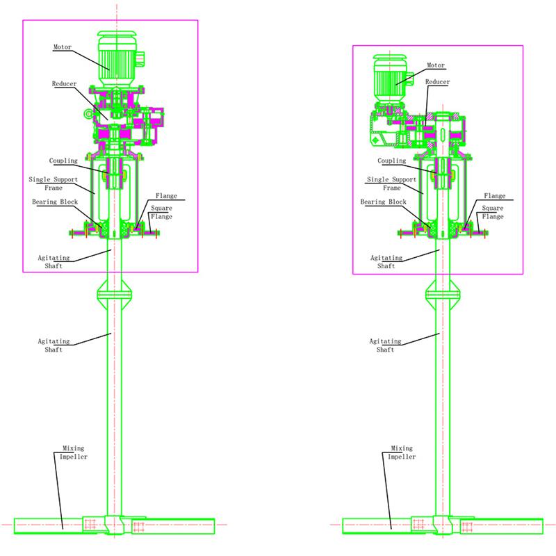1)縦型中央撹拌設置形式 撹拌軸と撹拌機が撹拌槽の中心線上に配置され、対称に配置されているのが特徴です。駆動方式はベルト伝動、ギヤ伝動、減速伝動があり、モーターによる直接駆動も可能です。混合装置の出力は 0.1 kW から数百 kW の範囲であり、通常の出力範囲は 0.2 ~ 22 kW です。一般に、小型の場合は 3.7kw 未満、中型の場合は 5.5 ~ 22kw、大型の場合は 22kw 以上です。小型ミキサーは食品業界で使用されます。低速タイプは100r/min以下、中速タイプは100〜400r/mm、高速タイプは400r/min以上です。用途に応じて羽根の構造を様々に組み合わせることができ、3枚羽根プロペラタイプもございます。タービンを本体とし、用途に応じて様々な構造形式に組み合わせることができます。これらの混合装置の多くは海外で標準化されています。速度範囲は 300 ~ 360 r/min、モーター出力は 0.4 ~ 15 kW です。ベルトドライブまたはギア伝動による一段減速で駆動します。